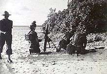 Later, in December 1942, the 27th Battalion was transferred from the 3rd Brigade to the 23rd Brigade. This unit had previously been a 2nd AIF unit, but the loss of several of its battalions when they had been deployed to Ambon, Timor and Rabaul, had resulted in it being re-formed with Militia battalions and the 27th joined the 7th and 8th Battalions to round out its establishment.[48] In March 1943, after having endured several bombings by Japanese aircraft since their arrival in Darwin the previous year, the battalion was replaced in the Darwin garrison and its personnel returned Adelaide for leave. In December, they regrouped on the Atherton Tablelands in Queensland for jungle training,[48] as the 23rd Brigade—then part of the 3rd Division[54]—was converted to the jungle establishment, in preparation for them undertaking active service in New Guinea.[55] Around this time the battalion was gazetted as an AIF battalion,[45][56] meaning that because more than 65 per cent of its personnel had volunteered for service outside of Australian territory, it could be deployed beyond the limits set out in the Defence Act (1903).[57]
