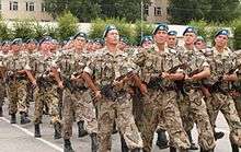The 35th Guards Air Assault Brigade is an airmobile brigade of the Kazakhstan Airmobile Forces. It is currently based in Kapchagay. The brigade traces its history back to the Soviet Union as the 111th Guards Airborne Regiment, formed in 1948 as part of the 11th Guards Airborne Division. After the 11th Guards Airborne Division was disbanded in April 1955, the regiment became part of the 105th Guards Vienna Airborne Division.[1] The 105th Guards Airborne Division was broken up in the fall of 1979 and the regiment became the 35th Separate Guards Air Assault Brigade.[2] After the Dissolution of the Soviet Union, the brigade became part of the Armed Forces of the Republic of Kazakhstan and was renamed the 35th Separate Guards Air Assault Brigade.[3][4]