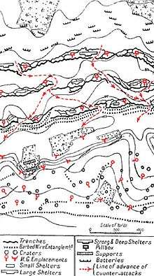 In a German General Staff publication, it was written that "Germany had been brought near to certain destruction (sicheren Untergang) by the Flanders battle of 1917".[133] In his Memoirs of 1938, Lloyd George wrote, "Passchendaele was indeed one of the greatest disasters of the war ... No soldier of any intelligence now defends this senseless campaign ...".[134] In 1939, G. C. Wynne wrote that the British had eventually reached Passchendaele Ridge and captured Flandern I Stellung; beyond them were Flandern II and Flandern III (which was nearly complete). The German submarine bases on the coast had not been captured but the objective of diverting the Germans from the French further south, while they recovered from the Nivelle Offensive of April, had succeeded.[135]