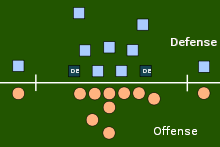 In American football, a 4–3 defense is a defensive alignment consisting of four down linemen and three linebackers. It is probably the most commonly used defense in modern American football and especially in the National Football League.