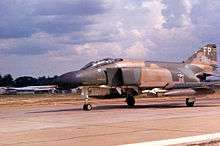 - ↑ The plane is configured for the "MiGCAP" escort role with Sparrow air-to-air missiles under the fuselage, and Sidewinder air-to-air missiles and extra fuel tanks under the wings