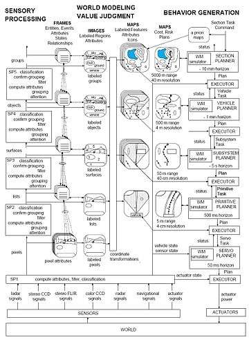 Sensory processing performs the functions of windowing, grouping, computation, estimation, and classification on input from sensors. World modeling maintains knowledge in the form of images, maps, entities, and events with states, attributes, and values. Relationships between images, maps, entities, and events are defined by pointers. These relationships include class membership, ontologies, situations, and inheritance. Value judgment provides criteria for decision making. Behavior generation is responsible for planning and execution of behaviors.[5]