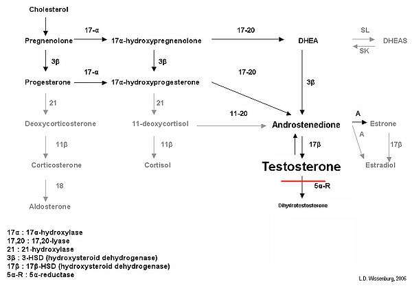 5α-Reductase is an enzyme that converts testosterone to 5α-dihydrotestosterone (DHT) in peripheral tissues. These enzymes also participate in the creation of such neurosteroids as allopregnanolone and THDOC, convert progesterone into dihydroprogesterone (DHP), and convert deoxycorticosterone (DOC) into dihydrodeoxycorticosterone (DHDOC). 5-ARD is biochemically characterized by low to low-normal levels of testosterone and decreased levels of DHT, creating a higher testosterone/DHT ratio.