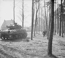 A Sherman Firefly of the 5th Canadian (Armoured) Division assists British troops of the 11th Battalion, Royal Scots Fusiliers, British 49th Infantry Division, to clear the Germans from Ede, the Netherlands, 17 April 1945.