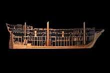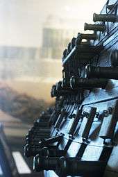 The 74-gun ship carried 28 (24-pounders- to 36-pounders) on the lower gun deck, 28-30 (18- to 24-pounders) on the upper gun deck, and 14-18 (6- to 12-pounders) on the upper works.[2] Crew size was around 500 to 750 men depending on design, circumstances and nationality, with British ships tending to have smaller crews than other navies. The French had large and small seventy-fours, called "grand modèle" and "petite modèle", the waterline length of a "grand modèle" seventy-four could be up to 182 feet.[3] This was copied by the Royal Navy in about two dozen such ships of its own, such as the HMS Colossus where they were known as Large, while the other seventy-fours built to be between 166–171 feet were known as Common.[4]
