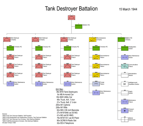 The 827th Tank Destroyer Battalion was activated on April 20, 1942, at Camp Forrest, Tennessee, one of five such battalions created that year. Initially armed with 75 millimeters (3.0 in) M3 GMC half-tracks, it later received the self-propelled M10 tank destroyer before being reorganized as a towed battalion, equipped with trucks and 3" anti-tank guns. It finally returned to a self-propelled unit, equipped with M18 Hellcats.[6] At no point during this constant reshuffling did the unit ever receive a full allocation of equipment.[7] At the same time, the original officer cadre was replaced twice—first with black officers, then with white officers from other disbanded segregated battalions. By the time the battalion sailed overseas, it had seen eight separate commanding officers.[8]