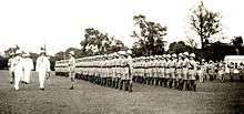 The 1st Battalion was serving in Ireland upon the outbreak of the war and was given orders to mobilise on 4 August, the day that Britain declared war on Germany. Part of the 15th Brigade, 5th Division the battalion left Belfast on 14 August and immediately embarked for France, where they became part of the British Expeditionary Force.[56] They saw their first action of the war against the German Army at the Battle of Mons in August 1914.[57] The 2nd Battalion was serving in Bombay, India in the 18th (Belgaum) Brigade, part of the 6th (Poona) Division, of the British Indian Army, upon the outbreak of war. The 2nd Battalion of the Norfolks fought in the Mesopotamian campaign. The treatment of prisoners after the fall of Kut al Amara in April 1916 mirrors that that would later befall the Royal Norfolks in the Far East during the Second World War.[58]