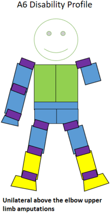 A6 is an amputee sport classification used by the International Sports Organization for the Disabled (ISOD).for people with acquired or congenital amputations. People in this class have one arm amputated above or through the elbow joint. Their amputations impact their sport performance, including being more prone to overuse injuries. Sports people in this class are eligible to participate in include athletics, swimming, cycling, amputee basketball, amputee football, lawn bowls, and sitzball.