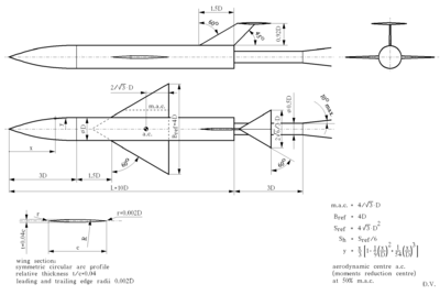 AGARD-B (see figure) is a body-wing configuration. All its dimensions are given in terms of the body diameter "D" so that the model can be produced in any scale, as appropriate for a particular wind tunnel. The body is an 8.5 diameters long solid of revolution consisting of a 5.5 diameters long cylindrical segment and a nose with a length of 3 diameters and having a local radius defined by the equation y = x/3 · [1 - 1/9 · (x/D)2 + 1/54 · (x/D)3].