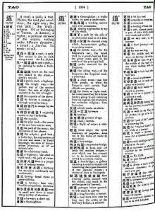 The Chinese character for dào "way; path; say; the Dao" or dǎo "guide; lead; conduct; instruct; direct" (or clarified with Radical 41 寸 "thumb; inch") is a good litmus test for a dictionary because it has two pronunciations and complex semantics. The sample entry from Giles' dictionary for tao44 (10,780) gives the character and number over pronunciations from Cantonese tou to Vietnamese dau on the left, and the translation equivalents and examples on the right. Note that {} brackets indicate translation equivalents added in the second edition.