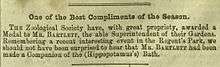 Bartlett supported D. W. Mitchell on the idea that the collection of animals held by the Zoological Society of London could be made accessible to the public for a small fee that could help the Society. It was open on Mondays for a fee of six pence. Queen Victoria gave him a gold watch for taking care of her pet birds. Dead birds were sent to him for taxidermic preservation and for his excellent exhibits, he received a gold medal at the Great Exhibition of 1851. He was among the first to reconstruct a specimen of the dodo and this was displayed at Sydenham Crystal Palace where he was also appointed naturalist around 1852. The restoration was however destroyed in the 1866 fire. He associated himself with the Zoological Society and was offered the position of superintendent made vacant by the death of John Thompson at the garden in Regents Park in 1859. As Superintendent, Bartlett became a familiar figure for visiting naturalists and corresponded with many across the world.[2] He was an agent for the acquisition of wild animals from suppliers such as Edward Blyth and was involved in their sale to circus agents such as P.T. Barnum. He kept the position at the zoo until his death and became a familiar figure. He became an authority on the care of wild animals and published papers in the Proceedings of the Zoological Society and other journals. He received a silver medal by the Zoological Society in 1872 and was made an associate of the Linnean Society in 1879.[1] Charles Darwin often discussed his ideas on sexual selection with Bartlett. He noted for instance: "I asked Mr. Bartlett, of the Zoological Gardens, who has had very large experience with birds, whether the male tragopan (one of the Gallinaceae) was polygamous, and I was struck by his answering, 'I do not know, but I should think so from his splendid colours.'"[3][4] When Darwin was studying the facial expressions of wild animals, he was introduced to the artistic and observational abilities of Joseph Wolf by Bartlett. Wolf was able to make illustrations of fleeting facial expressions for Darwin, although Wolf himself had reservations about Darwin's interpretations.[5]