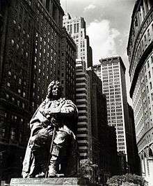 His 3x-great grandson was John Watts de Peyster, who commissioned a statue of his ancestor in the late 19th century. Sculpted by George Edwin Bissell, the statue was originally placed in Bowling Green Park in Manhattan in the late 1890s. Park and subway renovations forced its removal in 1972, and it was placed in Hanover Square from 1976 until 2004.[13][14][15][16] During subsequent renovations in Hanover Square, the statue was placed in a warehouse for 9 years. In the fall of 2013, it was restored to public view in its current location in Thomas Paine Park near the Supreme Court building. .[17]