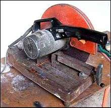 An abrasive saw, also known as a cut-off saw or chop saw, is a power tool which is typically used to cut hard materials, such as metals, tile, and concrete. The cutting action is performed by an abrasive disc, similar to a thin grinding wheel. Technically speaking this is not a saw, as it does not use regularly shaped edges (teeth) for cutting.