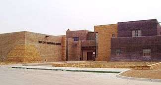 Tourism is a major source of income for the tribe.[3] In 2008 Pueblo Acoma opened the Sky City Cultural Center and Haak'u Museum at the base of the mesa, replacing the original, which was destroyed by fire in 2000. The center and museum seek to sustain and preserve Acoma culture. Films about Acoma history are shown and a café serves traditional foods. The architecture was inspired by pueblo design and indigenous architectural traditions with wide doorways in the middle, which in traditional homes make the bringing of supplies easier, and flecks of mica are in the windowpanes, a mineral which is used to create mesa windows. The complex is also fire resistant, unlike traditional pueblos, and they are painted light pinks and purples, to match the landscape surrounding it. Traditional Acoma artwork is exhibited and demonstrated at the Center, including ceramic chimneys crafted on the rooftop.[10] Arts and crafts also bring income into the community.[3]