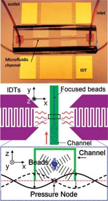 In addition to separate particles with different sign of acoustic contrast factors, acoustic method can also be used to separate particles with different size. Shi et al. reported a standing surface acoustic wave (SSAW) microfluidic device to separate microparticles with different diameters.(Fig. 7)[14] According to the equation of primary acoustic radiation force, larger particles with experience larger force than smaller particles. Shi et al. used interdigital transducers (IDTs) to generate SSAW field in a microfluidic channel, and they positioned the pressured nodes in the middle of the channel. When introducing a mixture of particles with different size from the edge of the channel, larger particles will migrate faster to middle of the channel and be collected at the center outlet. Smaller particles will not be able to migrate to the center outlet before they are collected from the side outlets. This experiment setup has also been used to separate blood components, bacteria, and hydrogel particles.[15][16][17]