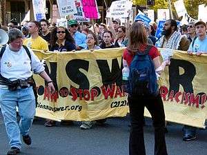 Act Now to Stop War and End Racism (ANSWER), also known as International A.N.S.W.E.R. and the ANSWER Coalition, is a United States-based protest umbrella group consisting of many antiwar and civil rights organizations. Formed in the wake of the September 11th attacks, ANSWER has since helped to organize many of the largest anti-war demonstrations in the United States, including demonstrations of hundreds of thousands against the Iraq War.[1][2] The group has also organized activities around a variety of other issues, ranging from the Israel/Palestine debate to immigrant rights to Social Security to the extradition of Luis Posada Carriles.