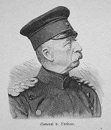 Born at Briesen near Friesack in Brandenburg, to Major Friedrich von Bredow (1787-1878) and Bernhardine Sophie (née von Wulffen) (1792-1859), he joined the Garde-Husaren-Regiment in 1832 as Unteroffizier.. By 1859, he had been given command of the 4th Dragoon Regiment. As a colonel, von Bredow led the 2nd Cavalry Brigade in the Austro-Prussian War of 1866, and was promoted to Major general.[1] He is best known as a hero of the Franco-Prussian War after the battle of Mars-la-Tour on August 16, 1870. During this battle he commanded the Prussian 12th Cavalry Brigade on one of the last successful massed cavalry charges in warfare. Before his assault von Bredow stated of that "it will cost what it will." "Von Bredow's Death Ride" resulted in massive casualties on the Prussian forces but he managed to defeat a French force that outnumbered them four to one. The event was used in the following decades by military tacticians to argue that cavalry charges could still win battles.[2] Von Bredow was promoted to Lieutenant general and given command of the 18th Infantry Division.
