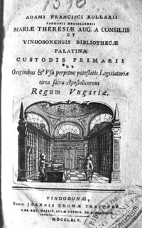 Adam F. Kollár began his career at the Imperial-Royal Library in 1748 as a scribe and eventually became its chief librarian and Councilor at the Court of the Habsburgs. Most of his appointments were readily approved by Empress Maria Theresa, with whom he curried favor, whose policies he underpinned with his scholarship and who became his only child's godmother.