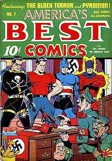 Apart from Hollywood films, Hitler was the subject for several comic book superheroes who battled Hitler directly or indirectly in comics published during World War II. Superheroes that fought Hitler include Superman, Captain America, The Shield, and Namor the Sub-Mariner. The first Captain America comic showed Captain America hitting Hitler on the jaw. Captain America's archenemy, Red Skull, was established as being an apprentice to Hitler. In Superman vol 1 #15 the dictator Razan appeared, who attempted to invade a nearby democratic nation. Superman defeated his army, and Razan was shot while trying to escape.