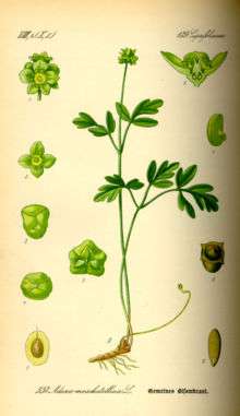 Adoxa moschatellina (moschatel, five-faced bishop,[1] hollowroot, muskroot, townhall clock, tuberous crowfoot) is an herbaceous perennial flowering plant in the family Adoxaceae. It grows throughout Europe, Asia, and North America, in hedgerows, cool forests, at low altitudes in the far north, to high altitudes in mountains in the south of its range. The plant and its flowers have a musk-like scent, which it emits towards evening when the dew falls. If the plant is bruised this scent disappears. In Europe, it flowers in April and May.