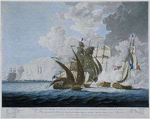 Maintaining a close line of battle, Hoste forced Dubourdieu to attack him directly, Dubourdieu attempting to personally board Hoste's Amphion at the head of the Italian soldiers carried aboard his flagship. Hoste responded to the attempt with fire at point blank range from a carronade containing over 750 musket balls.[33] The first shot killed Dubourdieu and almost all of his officers, creating confusion in the French squadron that resulted in Favorite being wrecked on Lissa's coastline. Hoste then engaged the following Flore and Bellone, forcing them both to surrender.[34] The head of the British line, led by the HMS Volage engaged the three remaining French and Italian ships, driving off Danaé and Carolina and capturing Corona. Flore too later escaped to the safety of French batteries off Lesina.[35]