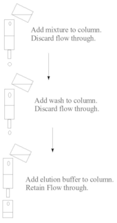Binding to the solid phase may be achieved by column chromatography whereby the solid medium is packed onto a column, the initial mixture run through the column to allow setting, a wash buffer run through the column and the elution buffer subsequently applied to the column and collected. These steps are usually done at ambient pressure. Alternatively, binding may be achieved using a batch treatment, for example, by adding the initial mixture to the solid phase in a vessel, mixing, separating the solid phase, removing the liquid phase, washing, re-centrifuging, adding the elution buffer, re-centrifuging and removing the eluate.