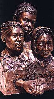 The memorial design for the 25-foot (7.6 m) granite monument features a map of the Atlantic area within the "Circle of Diaspora" in reference to the Middle Passage,[25] by which slaves were transported from Africa to North America. It is built of stone from South Africa and from North America, to symbolize the two worlds coming together.[26] The Door of Return, refers to "The Door of No Return", a name given to slave ports set up for involvement with the age-old local institution of slavery on the coast of West Africa, from which so many people were transported after sale by their native chiefs, never to see their homeland again. The memorial is designed to reconnect ethnic African Americans to their ancestors' origins.[26]