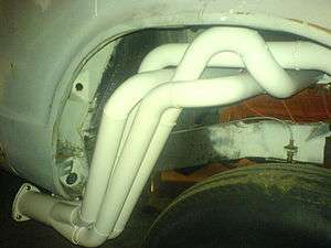 Switching from an exhaust manifold to exhaust headers (also known as extractors in Australia) will optimize the exhaust gas flow speed and in turn increase the high-end power of the engine.[1] This is done by using an individual pipe for each exhaust port that has smoother bends with a larger turn radius, decreasing airflow resistance, as well as a calculated pipe diameter to obtain a good scavenging effect for the specific engine capacity. The pipes then merge into a collector and then flow into a larger pipe (down pipe), just before the catalytic converter. With equal length headers, as each exhaust valve in the head of the engine is opened and exhaust gas is forced out, it passes down one of the header pipes and through to the down pipe, where the exhaust gas velocity causes a slight vacuum in another header pipe. This has an effect of scavenging exhaust gas from the cylinder, which is beneficial for performance. In performance engines, which have cam overlap, the scavenging effect will pull air through from the intake manifold as well, further increasing performance. The length of exhaust headers can be tuned to perform best at specific RPM ranges. Stock exhaust manifolds are usually made of cast iron and can be restrictive. Headers may or may not increase the dB level of the exhaust, depending on the original exhaust manifold it replaces and the engine. However, the pipes do "ring" with the exhaust pulses and increase underhood noise. Headers can be ceramic coated to reduce the heat radiated in the engine compartment, and to increase the temperature of the pipes which increases the velocity of the exhaust gases.