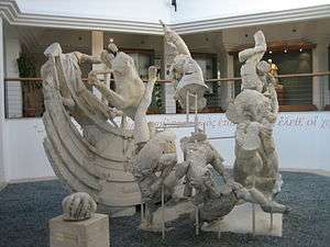 In 1959 a very large set of sculptures were discovered at Sperlonga, and are now in a museum there created for them. One section, the ship's prow of the "Scylla group", was signed by the same three names, this time with the names of their fathers, but in a different order. Sperlonga is the classical Spelunca mentioned by Tacitus and others, on the coast between Rome and Naples, where the emperor Tiberius had a celebrated villa. Tiberius was nearly killed when the grotto containing the statues collapsed in 26 AD, as Tacitus recounts, so they must predate this. The sculptures were in thousands of fragments, and reconstruction of the smaller pieces continues, amid much scholarly argument. The scenes all feature stories of Odysseus,[3] and are in a similar style to the Laocoön, but with many significant differences, not least in quality, being uneven but generally of much lower skill and finish (the group is also considerably larger).[1] Both the Sperlonga works and the Laocoön were probably created in Italy for very wealthy Roman patrons very likely from the Imperial circle; they were certainly owned by the Imperial family later, as Pliny says the Laocoön belonged to the Emperor Titus in his day.