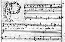 Steffani did not accompany the elector George to England; but in 1724 the Academy of Ancient Music in London elected him its honorary president for life; and in return for the compliment he sent the association a magnificent Stabat Mater, for six voices and orchestra, and three fine madrigals. The manuscripts of these are still in existence, and the British Museum possesses a very fine Confitebor, for three voices and orchestra, of about the same period. All these compositions are very much in advance of the age in which they were written; and in his operas Steffani shows an appreciation of the demands of the stage very remarkable indeed at a period at which the musical drama was gradually approaching the character of a merely formal concert, with scenery and dresses. But for the manuscripts at Buckingham Palace these operas would be utterly unknown; but Steffani will never cease to be remembered for his beautiful chamber duets, which, like those of his contemporary Carlo Maria Clari (1669–1745), are chiefly written in the form of cantatas for two voices, accompanied by a figured bass. The British Museum (Add. MSS. 5055 seq.) possesses more than a hundred of these charming compositions, some of which were published at Munich in 1679. Steffani visited Italy for the last time in 1727, in which year Handel, who always gratefully remembered the kindness he had received from him at Hanover, once more met him at the palace of Cardinal Ottoboni in Rome. This was the last time the two composers were destined to meet. Steffani returned soon afterwards to Hanover, and died on 12 February 1728 while engaged in the transaction of some diplomatic business at Frankfurt.[4]