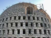 The tower is 14 metres (46 ft) high and has massive masonry walls about 3 metres (9.8 ft) thick with a number of apertures to let in air. Inside there is a massive column made of concrete. At night, the whole structure is allowed to cool, and during the day warm moist air enters the structure via the high apertures, cools, descends, and leaves the building by the lower apertures.[27] Knapen’s intention was that water should condense on the cool inner column. In keeping with Chaptal’s finding that the condensing surface must be rough and the surface tension must be sufficiently low that the condensed water can drip, the central column's outer surface was studded with projecting plates of slate. The slates were placed nearly vertically to encourage dripping down to a collecting basin at the bottom of the structure.[13] Unfortunately, the aerial well never achieved anything like its hoped-for performance and produced no more than a few litres of water each day.[28]