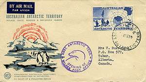 This 1959 cover from the Australian Antarctic Territory has a plain dark blue airmail etiquette in the upper left corner.