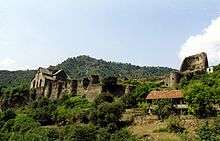 Ashot III established the Kingdom of Lori (Tashir-Dzoraget Kingdom) in Gugark for strategic reasons and enthroned Gurgen in 982.[7] Gurgen along with his brother Smbat are depicted on the sculptures of the patrons in both Sanahin and Haghpat. When the Tashir-Dzoraget kingdom fell as a result of Seljuk raids the Kyurikids migrated to Tavush and Metsnaberd yet they maintained ties with their ancestral fortress and compound in Akhtala. The fortress was built on an elevated rocky outcrop surrounded by deep canyons from three sides forming a natural protection.[8] The somewhat accessible parts between the cliffs are reinforced by towers and walls. The only entrance to the compound is on the northern side protected by bell-shaped towers and walls. The walls and towers of the fortress are built of bluish basalt and lime mortar. The Kyurikids gradually lost their influence under the Seljuk grasp by the end of the 12th century.