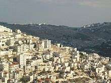 To solve the oxymoron of a Palestinian capital in the "eternal, united and indivisible capital of Israel", Israeli peace proposals pushed a mere symbolic capital "East Jerusalem" confined to the outskirts of Jerusalem, outside the municipal borders, notably in Abu Dis.[58] In such solution, Israel would keep primary sovereignty, while the Palestinians would get some form of self-rule in Arab neighbourhoods. Indeed, in 1996, the Palestinians began building government offices and even a parliament in Abu Dis, being part of East Jerusalem. Then, Israel cut it off from Jerusalem by building the separation wall.[59] In the end, East Jerusalem will be completely isolated from the West Bank by the wall and a long chain of Jewish settlements.[60]