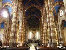 Between the 12th and 15th centuries the cathedral was reshaped in the form of late Gothic architecture.[4] It was restructured in the 15th century by bishop Andrea Novelli,[5] who arrived in Alba in 1484 to find the cathedral in poor condition. The most important renovation dates to 1652 to repair the damage caused by earthquakes in 1626.[2] After the earthquake, the ceiling of the nave fell. It was restored along with the construction of two side aisles, one dedicated to San Theobald of Provins and the other to SS. Sacramento. The last major restoration was between 1867 and 1878 by the engineer Edoardo Arborio Mella who modified the exterior of the cathedral as well as the interior décor.[6] This reconstruction included roofs, aisle vaults, the rebuilding of the apse, the rehabilitation of the facade, opening side windows and the replacement of the pavement.[2] The current appearance dates to the controversial restoration of the 19th century, of which the three portals and the crypt are from the original edifice.
