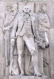 - George Washington as President, Accompanied by Wisdom and Justice, Washington Square Arch, New York City, 1917–18.[13]