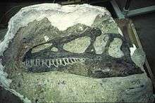 Paleontologists accept Allosaurus as an active predator of large animals. There is dramatic evidence for allosaur attacks on Stegosaurus, including an Allosaurus tail vertebra with a partially healed puncture wound that fits a Stegosaurus tail spike, and a Stegosaurus neck plate with a U-shaped wound that correlates well with an Allosaurus snout.[87] Sauropods seem to be likely candidates as both live prey and as objects of scavenging, based on the presence of scrapings on sauropod bones fitting allosaur teeth well and the presence of shed allosaur teeth with sauropod bones.[88] However, as Gregory Paul noted in 1988, Allosaurus was probably not a predator of fully grown sauropods, unless it hunted in packs, as it had a modestly sized skull and relatively small teeth, and was greatly outweighed by contemporaneous sauropods.[12] Another possibility is that it preferred to hunt juveniles instead of fully grown adults.[8][70] Research in the 1990s and first decade of the 21st century may have found other solutions to this question. Robert T. Bakker, comparing Allosaurus to Cenozoic sabre-toothed carnivorous mammals, found similar adaptations, such as a reduction of jaw muscles and increase in neck muscles, and the ability to open the jaws extremely wide. Although Allosaurus did not have sabre teeth, Bakker suggested another mode of attack that would have used such neck and jaw adaptations: the short teeth in effect became small serrations on a saw-like cutting edge running the length of the upper jaw, which would have been driven into prey. This type of jaw would permit slashing attacks against much larger prey, with the goal of weakening the victim.[56]