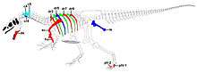 Allosaurus had nine vertebrae in the neck, 14 in the back, and five in the sacrum supporting the hips.[16] The number of tail vertebrae is unknown and varied with individual size; James Madsen estimated about 50,[6] while Gregory S. Paul considered that to be too many and suggested 45 or less.[12] There were hollow spaces in the neck and anterior back vertebrae.[6] Such spaces, which are also found in modern theropods (that is, the birds), are interpreted as having held air sacs used in respiration.[17] The rib cage was broad, giving it a barrel chest, especially in comparison to less derived theropods like Ceratosaurus.[18] Allosaurus had gastralia (belly ribs), but these are not common findings,[6] and they may have ossified poorly.[12] In one published case, the gastralia show evidence of injury during life.[19] A furcula (wishbone) was also present, but has only been recognized since 1996; in some cases furculae were confused with gastralia.[19][20] The ilium, the main hip bone, was massive, and the pubic bone had a prominent foot that may have been used for both muscle attachment and as a prop for resting the body on the ground. Madsen noted that in about half of the individuals from the Cleveland-Lloyd Dinosaur Quarry, independent of size, the pubes had not fused to each other at their foot ends. He suggested that this was a sexual characteristic, with females lacking fused bones to make egg-laying easier.[6] This proposal has not attracted further attention, however.