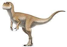 Allosauridae is one of four families in Carnosauria; the other three are Neovenatoridae,[34] Carcharodontosauridae and Sinraptoridae.[17] Allosauridae has at times been proposed as ancestral to the Tyrannosauridae (which would make it paraphyletic), one recent example being Gregory S. Paul's Predatory Dinosaurs of the World,[35] but this has been rejected, with tyrannosaurids identified as members of a separate branch of theropods, the Coelurosauria.[36] Allosauridae is the smallest of the carnosaur families, with only Saurophaganax and a currently unnamed French allosauroid accepted as possible valid genera besides Allosaurus in the most recent review.[17] Another genus, Epanterias, is a potential valid member, but it and Saurophaganax may turn out to be large examples of Allosaurus.[12] Recent reviews have kept the genus Saurophaganax and included Epanterias with Allosaurus.[7][17]
