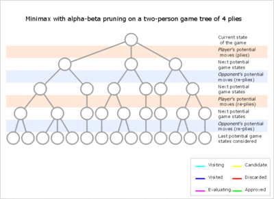 Alpha–beta pruning is a search algorithm that seeks to decrease the number of nodes that are evaluated by the minimax algorithm in its search tree. It is an adversarial search algorithm used commonly for machine playing of two-player games (Tic-tac-toe, Chess, Go, etc.). It stops completely evaluating a move when at least one possibility has been found that proves the move to be worse than a previously examined move. Such moves need not be evaluated further. When applied to a standard minimax tree, it returns the same move as minimax would, but prunes away branches that cannot possibly influence the final decision.[1]