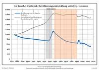 Development of population since 1875 within the current boundaries (Blue line: Population; Dotted line: Comparison to population development of Brandenburg state; Grey background: Time of Nazi rule; Red background: Time of communist rule)