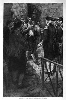 Following this first skirmish, General Schuyler became too ill to continue, so he turned command over to Montgomery. Schuyler left for Fort Ticonderoga several days later.[29] After another false start, and the arrival of another 800–1000 men from Connecticut, New Hampshire, and New York, as well as some of the Green Mountain Boys,[30] Montgomery finally began besieging Fort St. Johns on September 17, cutting off its communications with Montreal and capturing supplies intended for the fort. Ethan Allen was captured the following week in the Battle of Longue-Pointe, when, overstepping instructions to merely raise local militia, he attempted to take Montreal with a small force of men.[31] This event resulted in a brief upturn in militia support for the British; but the effects were relatively short-lived, with many deserting again in the following days.[32] After an attempt by General Carleton to relieve the siege failed on October 30, the fort finally surrendered on November 3.[33]