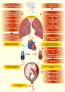 It is thought that this condition results from amniotic fluid entering the maternal circulation via the uterine veins, which then has either a direct effect on the lungs, or triggers an immune response in the mother.[6]