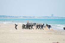 Amphibious warfare is a type of offensive military operation that today uses naval ships to project ground and air power onto a hostile or potentially hostile shore at a designated landing beach.[1] Through history the operations were conducted using ship's boats as the primary method of delivering troops to shore. Since the Gallipoli Campaign specialised watercraft were increasingly designed for landing troops, materiel and vehicles, including by landing craft and for insertion of commandos, by fast patrol boats, zodiacs (rigid inflatable boats) and from mini-submersibles.
