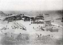 Initial landings took place in unmodified rowing boats that were extremely vulnerable to attack from the shore defences. The first purpose built landing craft were built for the campaign. SS River Clyde, built as a collier, was adapted to be a landing ship for the Landing at Cape Helles. Openings were cut in her steel hull as sally ports from which troops would emerge onto gangways and then to a bridge of smaller boats from the ship to the beach. Boiler plate and sandbags were mounted on her bow, and behind them a battery of 11 machine guns was installed. The machine gun battery was manned by Royal Naval Air Service men. Work began on painting River Clyde's hull sandy yellow as camouflage, but this was incomplete by the time of the landing.[10]