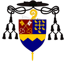 Blazon: Per fesse dancetté Or and Azure a chief per pale Gules and of the second charged on the dexter with two keys in saltire Or and Argent and on the sinister with a Cross Flory between five martlets of the first. (College of Arms, London 1922). Ensigned with an abbot's crosier in pale behind the shield Or garnished with a pallium crossing the staff argent and a galero with cords and twelve tassels disposed on either side of the shield in three rows of one, two, and three all Sable.