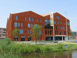 The AUC academic building, opened in 2012, was designed by Mecanoo architects. Its exterior appearance is dominated by a façade of rust-coloured steel plates. The interior design received praise in the media for its "open character".[17] The building won the 2013 Amsterdam Architecture Prize, for "the simplicity of its shape [and] its surprising interior. A variety of different types of space with a range of educational functions meet, connect and merge under one substantial roof, which is spectacular and yet unobtrusive."[18]