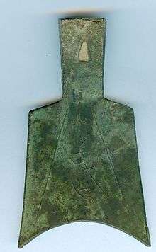 - Pointed shoulder spades: This type of spade has pointed shoulders and feet, and a long hollow handle. There are three parallel lines on the obverse and reverse, and occasionally inscriptions. They are found in N.E. Henan and in Shanxi, territory of the Duchy of Jin, later to become Zhao. They are held to be somewhat later in date than the square shouldered spades. Their shape seems to be designed for ease of tying together in bundles, rather than developed from any particular agricultural instrument.[1]:17