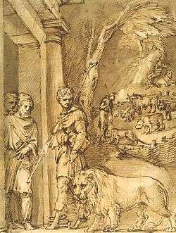 Renaissance prints of the story are based on the Classical accounts. Agostino Veneziano depicts the slave Androcles being freed by the Emperor in a work from 1516-17 now in the LACMA collection.[13] There is also an early pen and wash drawing by Baldassare Peruzzi dating from the 1530s in the Hermitage Museum. Dependent on the account by Aulus Gellius, it depicts Androcles walking through a doorway with the lion on a lead at his heel.[14] Other artists have preferred the scene of Androcles pulling the thorn from the lion's paw, as in Bernhard Rode's print of 1784.[15] A later American example is Walter Inglis Anderson's block print scroll of 1950,[16] which was based on his 1935 painting.[17]