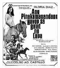 Ang Pinakamagandang Hayop sa Balat ng Lupa (although "The Most Beautiful Animal in the World" is the official translation, the literal meaning of the title is "The Most Beautiful Animal on the Surface of the Earth") is a 1974 Tagalog-language film from the Philippines. The story was written by Celso Ad. Castillo. The screenplay was written by Rafael Ma. Guerrero. The film starred Filipino actors Gloria Diaz (1969 Miss Universe title holder), Vic Vargas, and Elizabeth Oropesa. The film was produced by Gemini Films International and was shot in Sicogon Island of Carles, Iloilo in the Visayas region of the Philippines.[1]